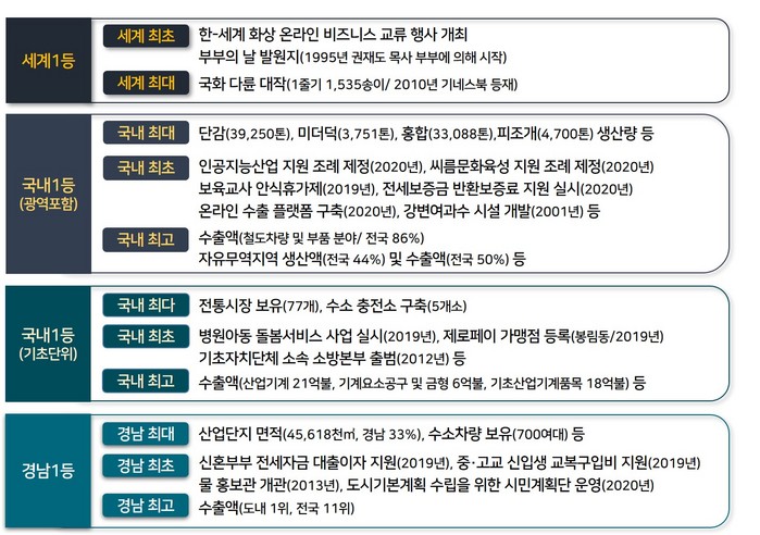 이번에 발굴된 것들에는 단감, 미더덕, 홍합, 피조개(국내 최대 생산량)와 국화(국내 최초 상업 재배, 국내 최대 재배면적) 등의 농수산물 뿐만 아니라 온라인 수출 교역 플랫폼인 큐피트 센터(국내 최초 구축), 스마트 선도산단 지정(국내 최초), 인공지능 산업 육성 지원 조례 제정(국내 최초), 수소 충전소(국내 기초자치단체 중 최다 개소 보유), 경남 최대 수소차량 보유(700여대) 등의 미래산업 관련 항목도 다수 확인됐다.