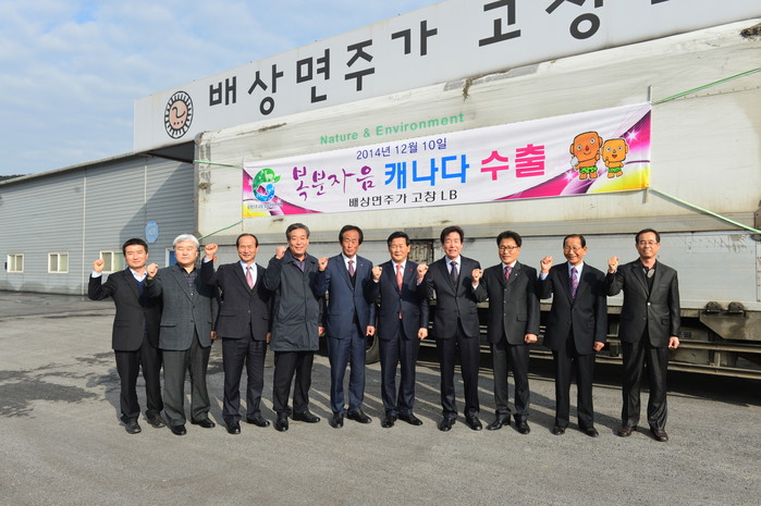 ▲박우정 고창군수(가운데)와 배상면주가 고창LB 관계자들이 지난달 10일 복분자음 캐나다 수출 기념식에서 포즈를 취하고 있다. |