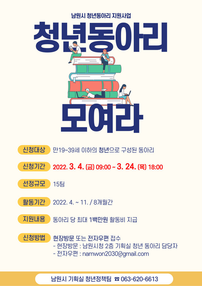 지원대상은 만19세부터 39세 이하의 남원시 청년 3인 이상으로 구성된 동아리로, 공익‧사회‧문화‧환경 등 분야를 막론하고 월 1회 이상 자발적인 모임이 가능한 동아리라면 신청이 가능하다.