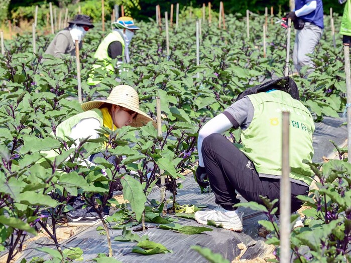 농식품 전문 매장 농협 하나로마트를 운영하는 농협하나로유통·농협유통은 14일 농협중앙회에서 추진하는 전국 동시 '범농협 한마음 농촌 일손 지원의 날' 행사 동참을 위해 안양원예농협 관내 농가를 찾아 가지 순자르기와 잡초 제거를 했다.