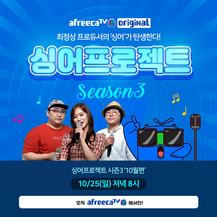 아프리카TV는 10월 25일(일) 오후 8시, ‘싱어프로젝트 시즌3’ 10월 편 본선 무대를 생중계한다고 밝혔다. 싱어프로젝트는 참가자의 노래 실력만으로 우승자를 가리는 실시간 서바이벌 오디션 콘텐츠로, 매월 본선 경연을 통해 우승자를 선발하고 월별 우승자에게는 국내 정상급 작사가·작곡가와 함께 음원 발매와 뮤직드라마 제작을 할 수 있는 기회를 제공한다.