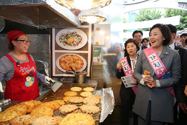 | ▲박영선 중소벤처기업부 장관이 지난달 20일 서울 광장시장에서 ‘가치삽시다!’ 캠페인을 펼치고 있다.(중기부 제공) |