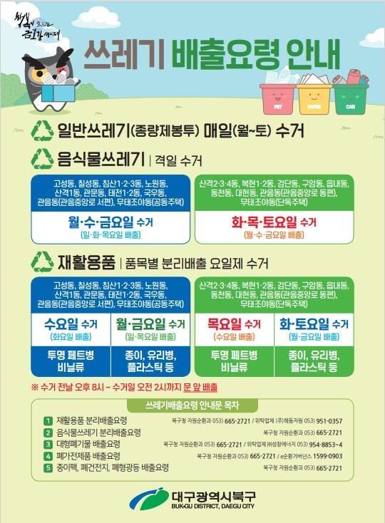 [로컬세계=박세환 기자] 대구 북구청은 올바른 쓰레기 배출요령을 알리기 위해 안내서를 제작하여 관내 모든 공동주택 관리사무소와 동 행정복지센터 통장들에게 배포한다고 23일 밝혔다.