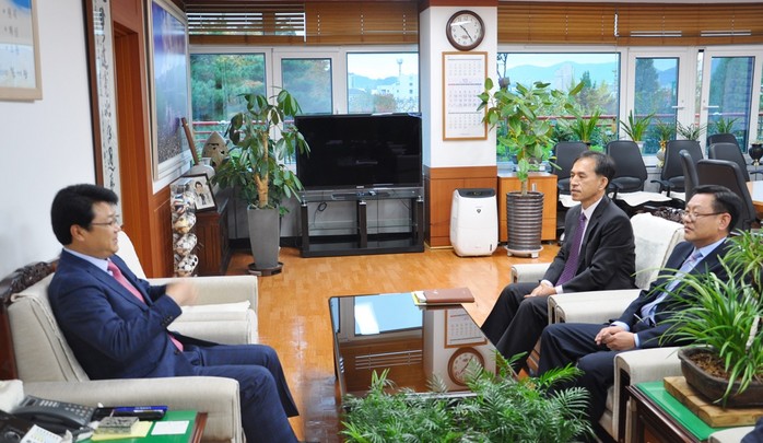 | ▲ 복기왕 아산시장(왼쪽)과 김종권(오른쪽 안경쓴 이) 대전지방조달청장은 조달현안에 대해 논의를 하고 있다. |