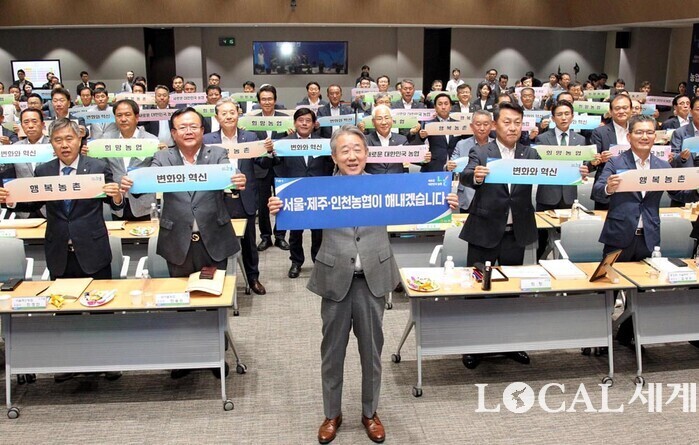 강호동 회장이 ‘새로운 대한민국 농협’ 달성 결의를 보이는 퍼포먼스를 하고 있다. 강호동 농협중앙회장은 19일 농협중앙회 서울본부에서 서울·제주·인천농협 조합장, 중앙회 임직원 등 150여명이 참석한 가운데 지역본부 현장경영을 개최했다.