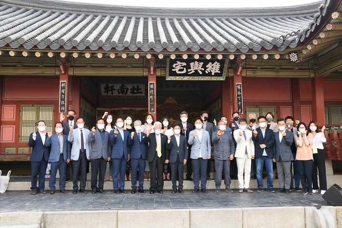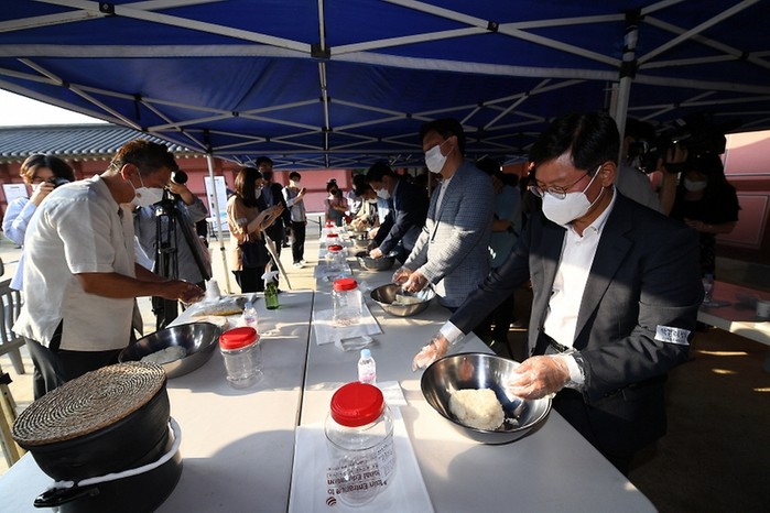 ‘막걸리 빚기’가 국가무형문화재로 지정된 것을 기념해 문화재청이 지난 26일 오후 수원 화성행궁에서 개최한 기념행사에 참석한 시민들과 김현모 문화재청장(오른쪽)이 막걸리를 빚고 있다.