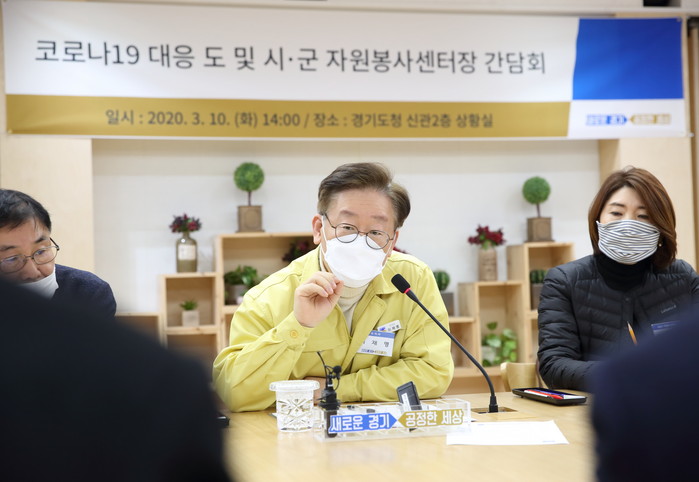 | ▲지난 10일 오후 경기도청 상황실에서 이재명 경기도지사가 권석필 경기도 자원봉사센터장 및 31개 시·군 자원봉사센터장들과 코로나19 대응 경기도 및 시·군 자원봉사센터장 간담회 갖고 있는 모습.(경기도 제공) |