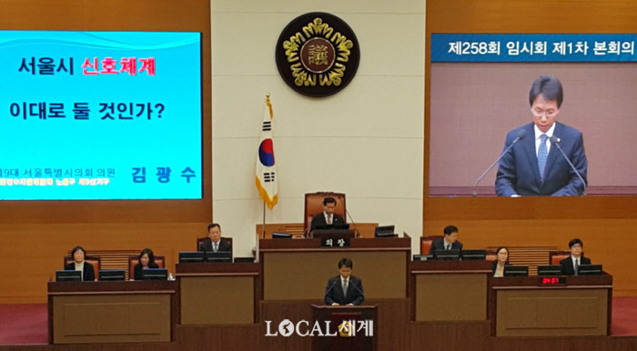 ▲ 김광수 서울시의원이 서울시의회 제258회 임시회에서 5분발언을 통해 서울시 신호체계의 문제점과 개선방향을 제시하고 있다. © 로컬세계 |
