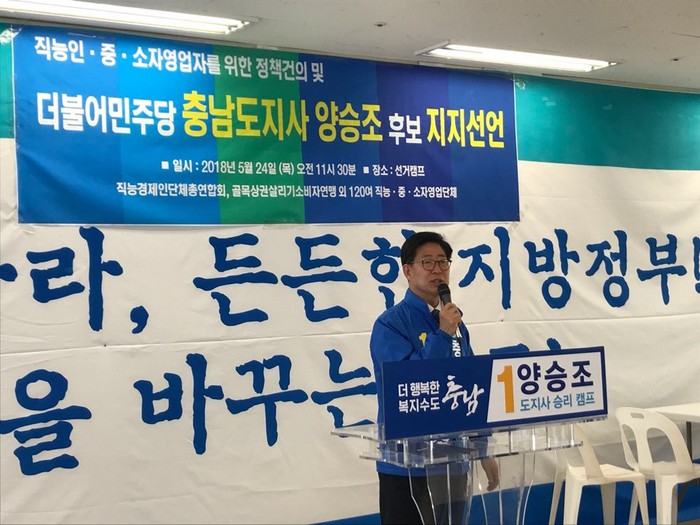 [로컬세계 최홍삼 기자]직능경제인단체총연합회(총회장 오호석)가 24일 오전 양승조후보 선거사무소를 직접 방문해 충남지사에 출마한 더불어민주당 양승조 후보 지지를 선언했다.