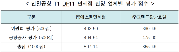 이번 입찰에는 에스엠면세점과 그랜드관광호텔 2개 업체가 참가했다. 심사 결과 그랜드관광호텔은 위원회 평가점수 390.49점, 공항공사 평가점수 475점, 총 865.49점을 획득해 경쟁사인 에스엠면세점 제치고 인천공항 제1여객터미널 출국장 면세점에 선정됐다.