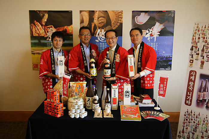 | ▲4일, 관광설명회 및 상담회에서 관계자들이 니가타현의 유명 특산품 사케를 들고 포즈를 취하고 있다. (좌측부터 아이다 켄스케 관광진흥과 광역국제관광실 주사, 아베 타츠야 니가타현 서울 사무소 소장, 마스다 히로시 관광 분야 부지사 및 기도 마사히로 관광진흥과 광역국제관광실 실장.) |