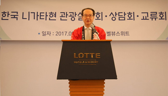 | ▲4일, 일본 니가타현은 서울 롯데호텔 소공동 본점에서관광콘텐츠 제공 및 신규 관광객 유치를 목적으로 관광설명회 및 상담회를 개최했다. 니가타현의 마스다 히로시 관광 분야 부지사가 인사말을 하고 있다.(사진제공=레인보우커뮤니케이션) |