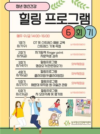 [로컬세계 부산=맹화찬 기자]부산시 남구정신건강복지센터는 오는 8월 7일부터 23일까지(매주 수·금요일) 청년들의 스트레스 예방 및 소진을 위한 힐링 프로그램을 진행할 예정이다.