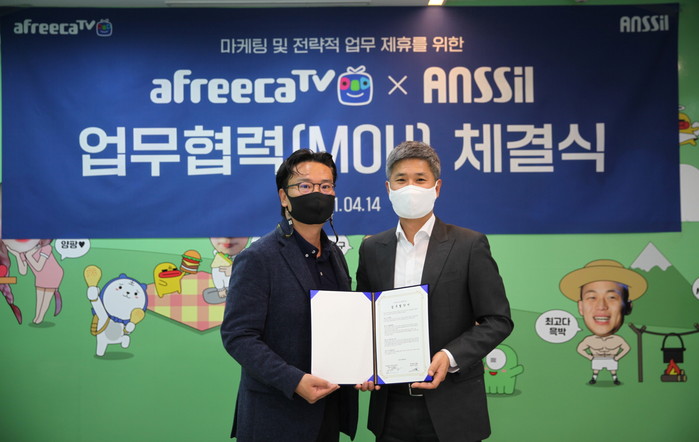 아프리카TV는 매트리스 전문 브랜드 ㈜앤씰(ANSSil)과 공동 마케팅 활동을 위한 업무협약을 체결했다고 26일 밝혔다. 이날 협약식에는 아프리카TV 정찬용 대표이사와 앤씰 송범근 대표가 참석했다.