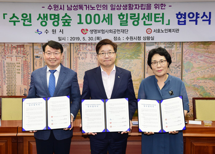 수원시와 서호노인복지관, 생명보험사회공헌재단은 30일 시청 상황실에서 ‘수원 생명숲 100세 힐링센터 운영을 위한 협약’을 체결하고, 원활한 사업 추진을 위해 협력키로 했다.