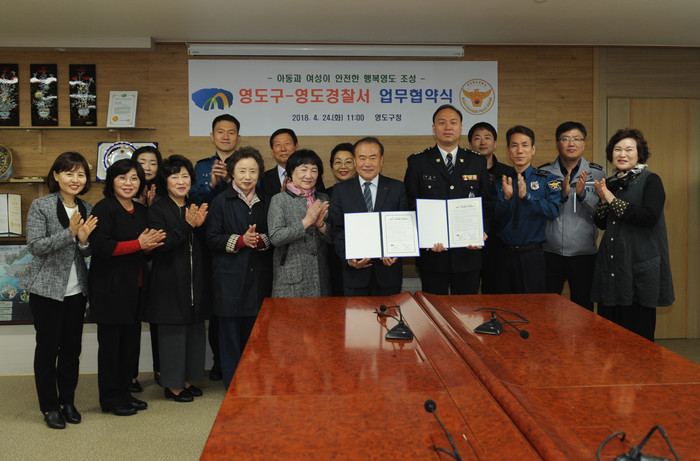[로컬세계 맹화찬 기자]부산 영도구와 영도경찰서는 24일 영도구청에서 아동과 여성의 안전 강화 및 범죄 취약지역 환경개선을 위해 ‘아동과 여성이 안전한 행복영도 조성에 관한 업무협약(MOU)’을 체결했다고 밝혔다.