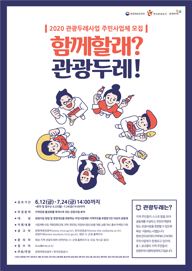 문화체육관광부는 코로나19로 위축된 지역 공동체성 회복 및 창업을 적극 지원하기 위해 한국관광공사와 함께 오는 7월 24일까지 ‘2020년 관광두레’ 신규 주민사업체를 모집한다고 12일 밝혔다.