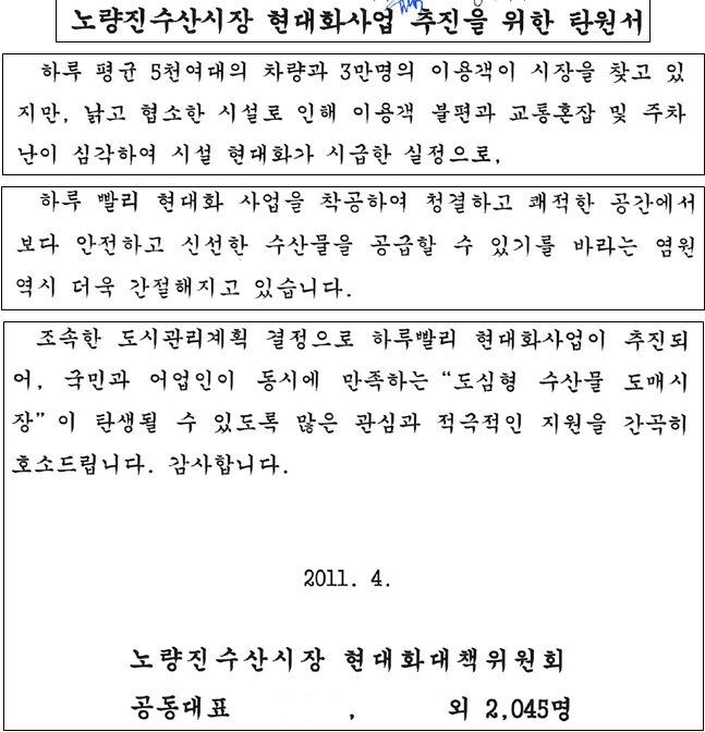 수협 측은 지난 2011년 추가부지 확보 문제로 인해 현대화사업이 지연되자 이를 우려한 상인 2000여 명이 하루 빨리 청결하고 깨끗한 공간에서 영업하고 싶다는 취지로 정부 등에 탄원서를 제출한 내용을 제시하며 “당시 상인들도 옛 시장에서 영업을 지속하는 것이 불가능하다는 점에서 현대화사업을 강력히 촉구해왔다”고 강조했다.