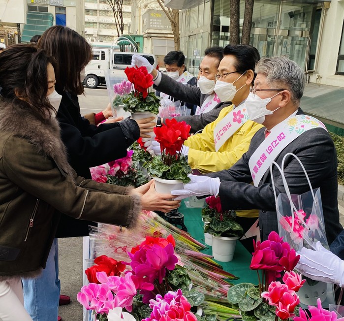 이들은 출근하는 종로구청 직원들에게 장미, 시클라멘 등 300여개의 꽃송이를 나눠주며, 꽃 생활화 등 화훼 소비 촉진에 적극 동참해 줄 것을 당부했다.