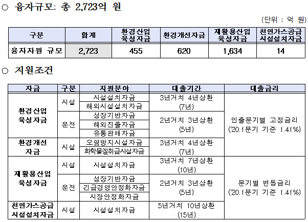 한국환경산업기술원에 따르면 분야별로는 재활용산업육성자금 1634억원, 환경개선자금 620억원, 환경산업육성자금 455억원, 천연가스공급시설설치자금 14억원이며 융자신청 접수는 분기별로 진행된다.