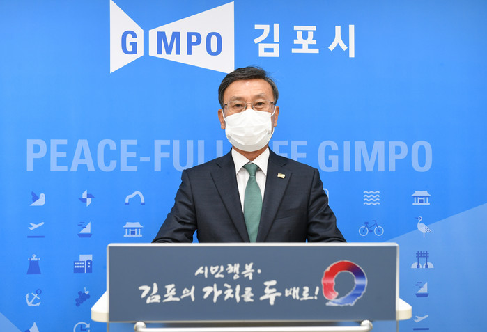 ▲정하영 시장이 17일 오후 긴급 브리핑을 갖고 18일 0시부터 김포시 내 코인노래방을 제외한 모든 노래연습장에 대해 집합금지를 실시한다’고 밝혔다.(김포시 제공) |