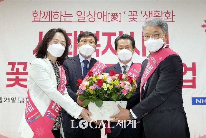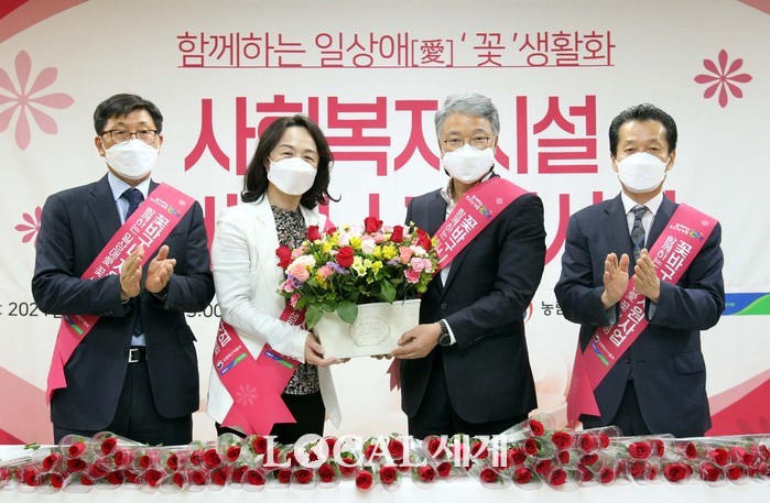 농협(회장 이성희)은 코로나19 장기화로 어려움을 겪고 있는 화훼농가를 돕고 노인·장애인의 코로나 블루 극복을 위해 28일 경기도 고양시 대화노인종합복지관에서 하명곤 농협경제지주 판매유통본부장, 화훼생산농협 조합장 등이 참석한 가운데 사회복지시설에 꽃바구니 및 후원물품을 전달했다.