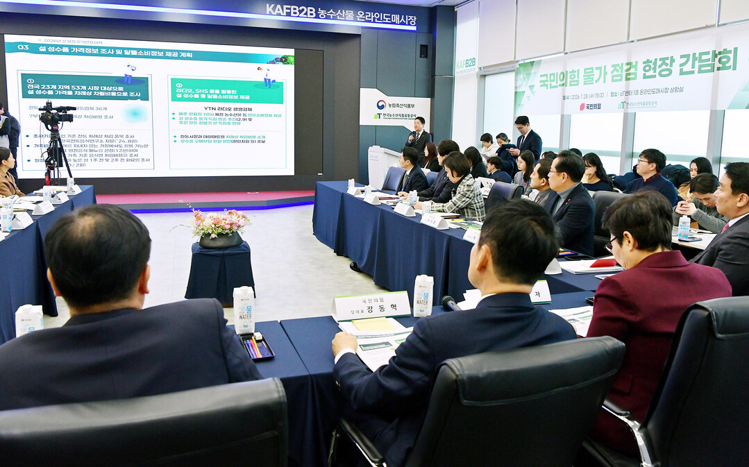 한국농수산식품유통공사(aT, 사장 홍문표)에 따르면 국민의힘(당 대표 장동혁) 지도부가 설 명절을 맞이하여 28일 서울 aT센터를 방문해 안정적인 물가 관리를 위한 정책을 점검하고 농산물을 유통하는 주요업계와 간담회를 개최했다고 밝혔다.