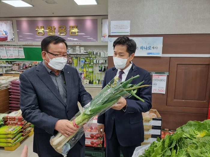 | ▲19일, 농협서울지역본부는 남서울농협 하나로마트를 찾아 식품안전점검을 실시했다.(왼쪽부터 남서울농협 안용승 조합장, 농협서울지역본부 황준구 본부장)/ 서울농협 제공 |