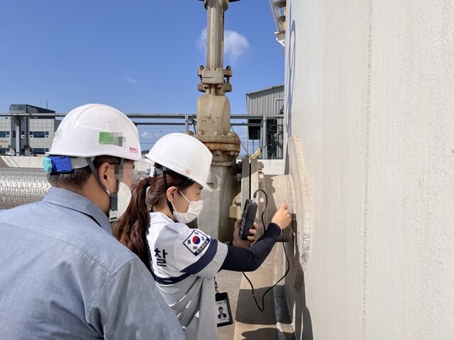 ▲ 지난 해 8월에 실시한 해양시설 점검 당시 두께측정기를 화용하여 배관을 점검했다. 군산해경 제공 |