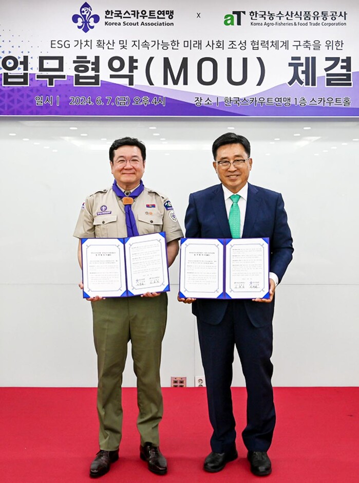 한국농수산식품유통공사(사장 김춘진)와 한국스카우트연맹(총재 이찬희)은 7일 여의도 한국스카우트연맹 본부에서 미래인재 양성과 저탄소 식생활 확산을 위한 업무협약을 체결했다.