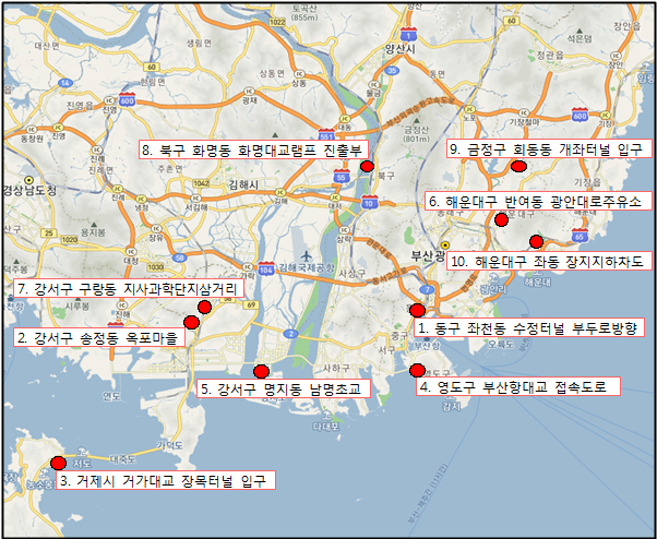 시내도로 중에서는 관문대로 수정터널, 강서구 옥포마을, 거가대교 장목터널 입구, 부산항대교 접속도로, 강서구 남명초교 순으로 나타났다.