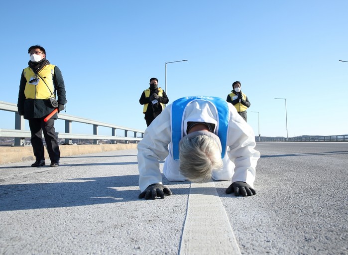 ▲이재강 경기평화부지사가 15일 개성공단 재개 선언 촉구 삼보일배에 나서고 있다.(경기도 제공) |