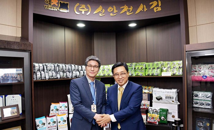 ▲㈜신안천사김 현장 방문 사진. 김춘진 한국농수산식품유통공사 사장(우측), 권동혁 ㈜신안천사김 대표(좌측)aT 제공 |