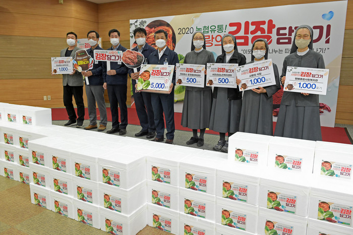 | ▲18일 서울 서초구 청계산로 하나로마트 양재점에서 ‘2020년 사랑의 김장 담그기’ 행사를 진행한 가운데 정연태 대표이사가 복지 기관 관계자에게 김장김치 5,000포기를 기부하고 있다. |