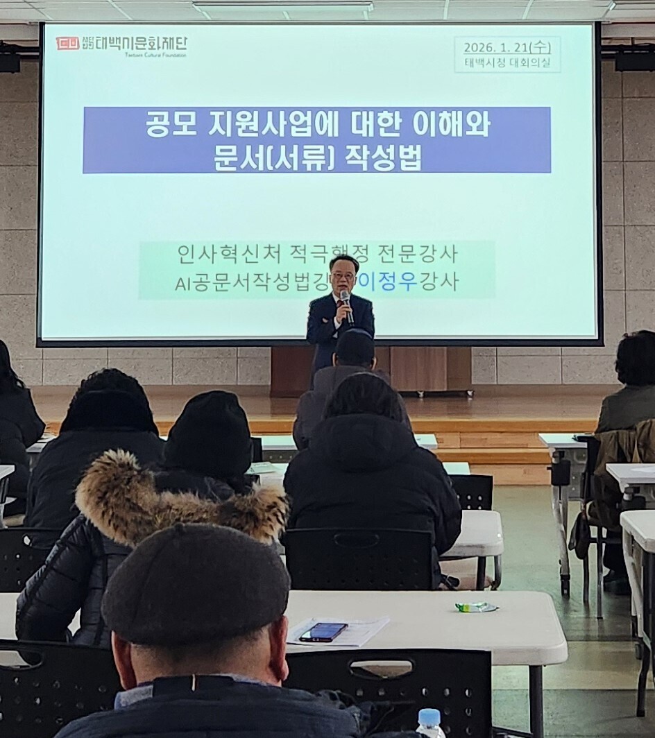 [로컬세계 = 박상진 기자]강원 태백시문화재단은 지난 21일 태백시청 대회의실에서 관내 문화예술인 관계자 30여 명을 대상으로 ‘문화예술지원사업 설명회에 따른 사업계획서 작성 교육’을 실시했다고 밝혔다. 교육은 공문서작성법과 AI 활용 분야 전문가인 이정우 강사를 초청해 진행됐다.