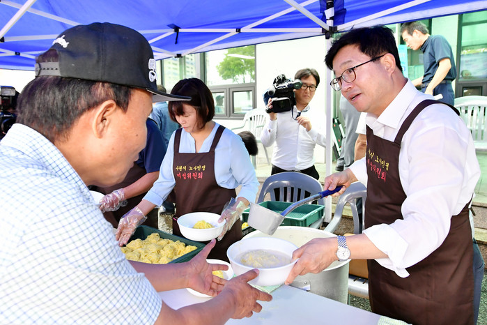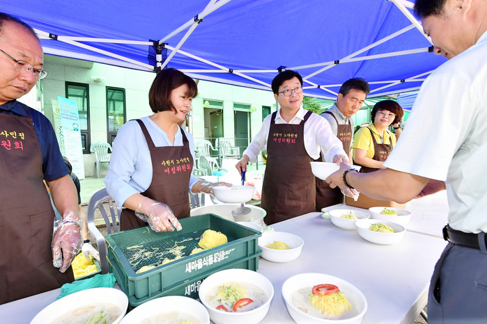 염태영 수원시장이 12일 수원 고등동 쌍우물택시쉼터에서 택시노동자들에게 콩국수를 배식하고 있다. 수원시와 수원시노사민정협의회가 마련한 이날 행사에는 택시노동자 300여 명이 참여해 점심을 함께했다.