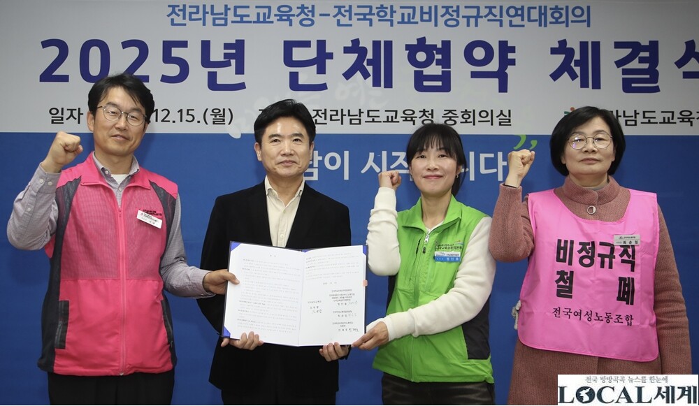 [로컬세계 = 김명진 기자]전라남도교육청과 전국학교비정규직연대회의는 지난 15일 교육 현장의 노사 상생을 바탕으로 교육공무직원의 권익 신장과 근로 여건 개선을 골자로 한 ‘2025년 단체협약’을 체결했다.