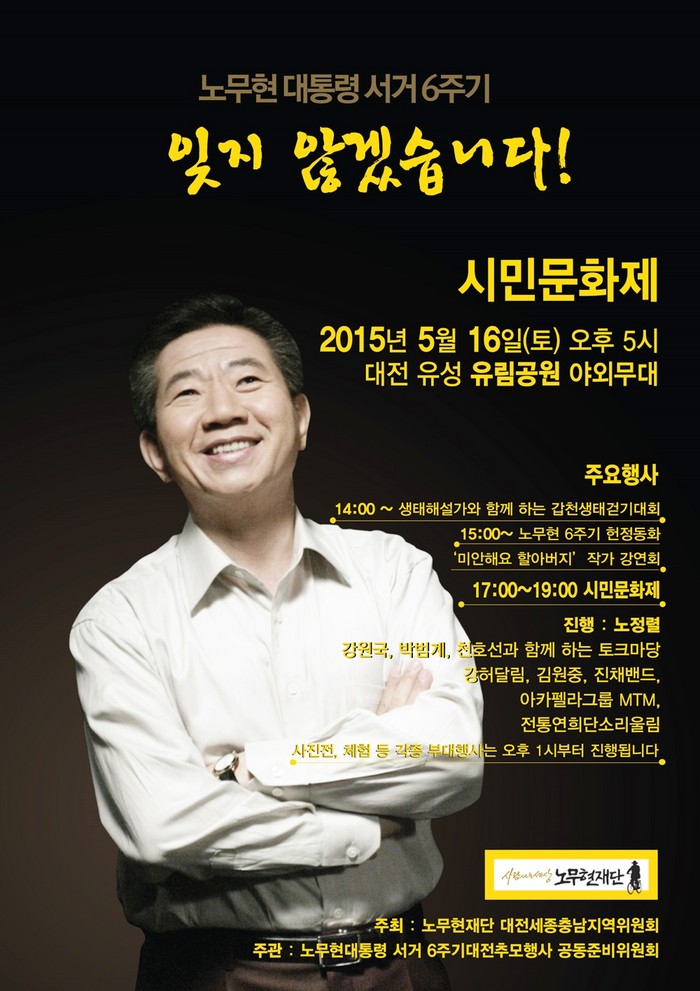 또한 오후 2시부터는 생태해설가와 함께하는 갑천생태걷기대회, 노무현6주기헌정동화 ‘할아버지 미안해요’ 작가강연회가 열린다. 이어 방송인 노정렬씨의 사회로 ‘대전시민문화제’가 진행된다.