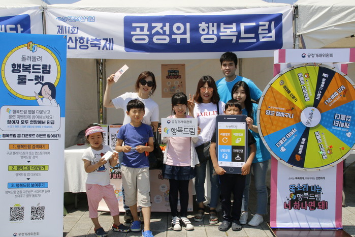 | ▲공정거래위원회(위원장 김상조)는 26일 오후 부산 국립해양박물관 일원에서 부산항 축제 방문객을 대상으로 ‘행복드림 열린소비자포털’홍보부스를 운영했다. 행복드림 앱 다운로드 이벤트에 참여한 방문객들이 기념촬영을 하고 있다.(공정거래위원회 제공) |