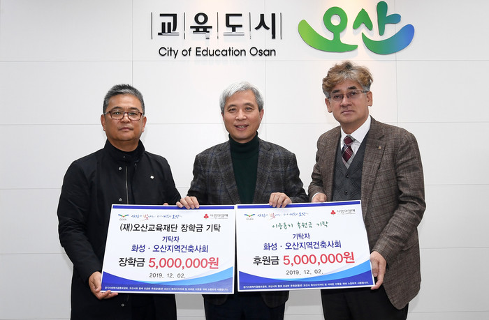 | ▲화성·오산지역건축사회 장학금과 이웃돕기 후원금 전달.(오산시 제공) |