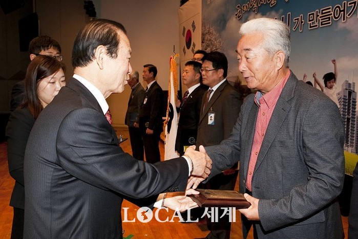 | ▲ 전근식(오른쪽) 회장이 감사패를 받는 모습. © 로컬세계 |