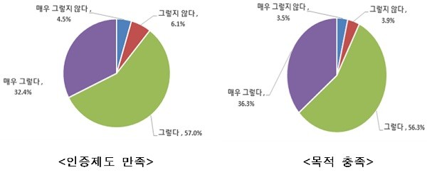 인증기업의 89.4%는 환경표지 인증에 대해 ‘만족한다’고 답변해 전반적인 기업 만족도는 매우 높은 편이었으며, 관련 제도가 국민의 삶 향상에 기여한다고 생각하는 기업은 88%를 차지했다.