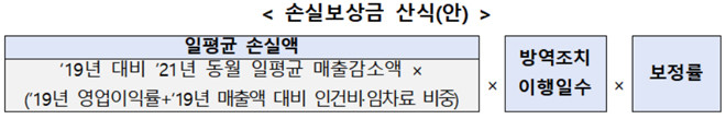 손실보상금은 코로나19 영향이 없었던 2019년 대비 올해 동월 일평균 손실액에 방역조치 이행기간과 보정률을 적용해 산정할 방침이다.