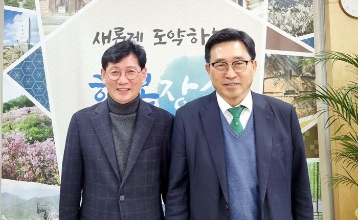 ▲전북 장수군청 방문 기념사진. 한국농수산식품유통공사 김춘진 사장(우측 ), 장수구청 최훈식 군수(좌측) aT 제공 |