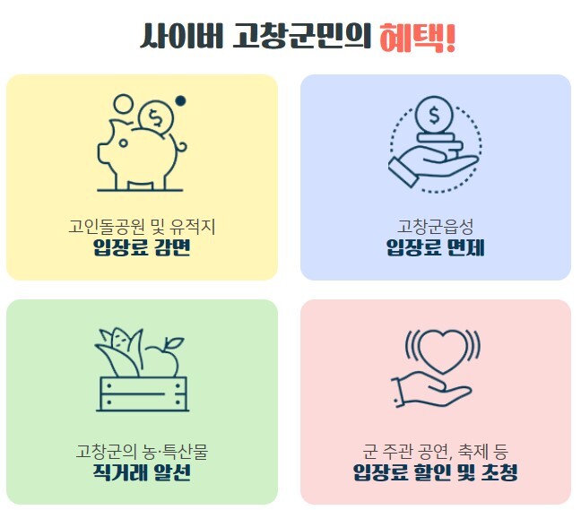 군은 ‘사이버 고창군민’이 고창의 고정 관광객으로 고창 활력 증진의 힘이 될 것으로 보고 있다. 오는 4월부터 ‘사이버 고창군민 홈페이지’를 운영해 사이버 고창군민증을 발행해주고, 고창의 생생한 소식을 사이버 군민들에게 전달할 계획이다.