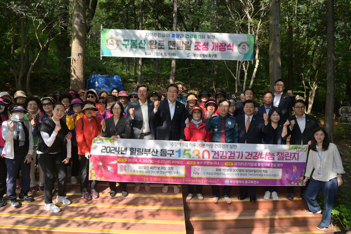 [로컬세계 부산=맹화찬 기자]부산광역시 동구는 지난 9일 구봉산 치유숲길에서 구청장, 시·구의원, 지역주민 등 80여 명이 참석한 가운데 구 최초로 조성된 구봉산 황토 맨발길 준공 기념과 건강나눔 챌린지 선포식을 위한 「구봉산 황토 맨발길」 개장식을 개최하였다.