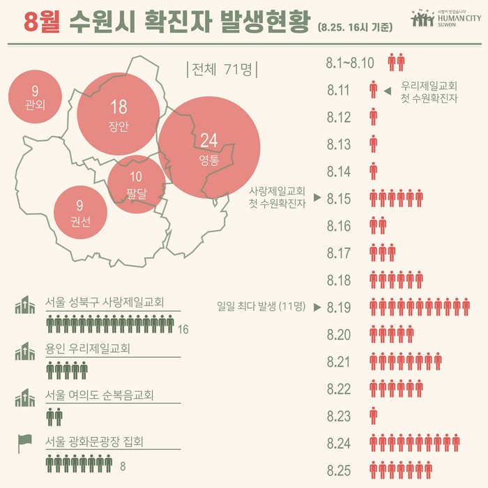 수원시에서 8월에 발생한 코로나19 확진자 수는 71명(25일 16시 현재, 검역소 확진자 제외)인데, 이는 수원시 전체 지역 확진자(183명)의 38.8%에 이르는 수치다. 8월 검역소 확진자는 2명이다(총 23명).