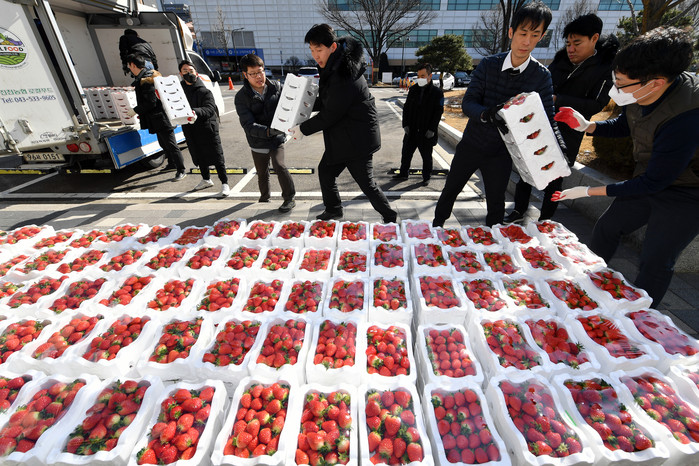| ▲수원시 직원들이 18일 진천에서 온 딸기 상자를 내리고 있다.(수원시 제공) |