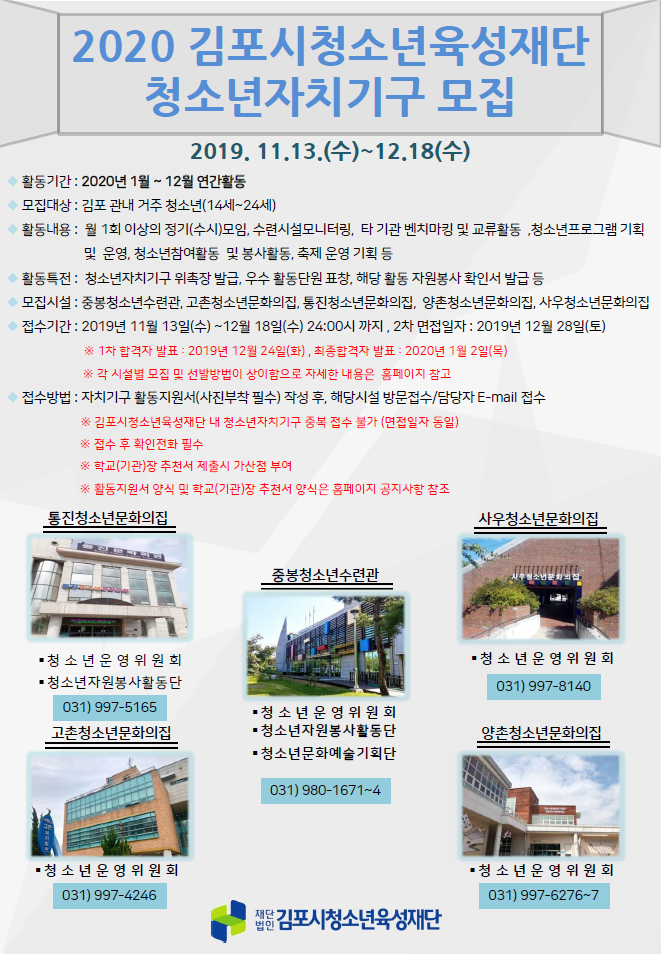 모집 대상은 김포 관내 14세 이상 24세 이하의 청소년이며, 각 자치기구별 20명 내외로 모집한다.