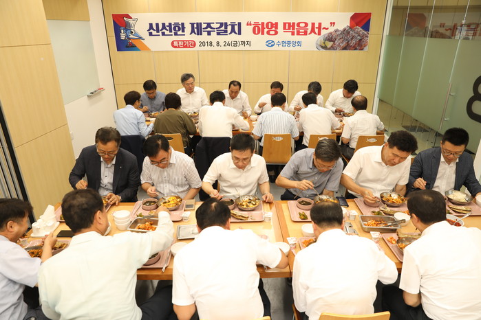 | ▲22일 서울 송파구 수협중앙회 본사에서 수협 임직원들이 갈치 소비촉진 행사에 참여하고 있다.(수협중앙회 제공) |
